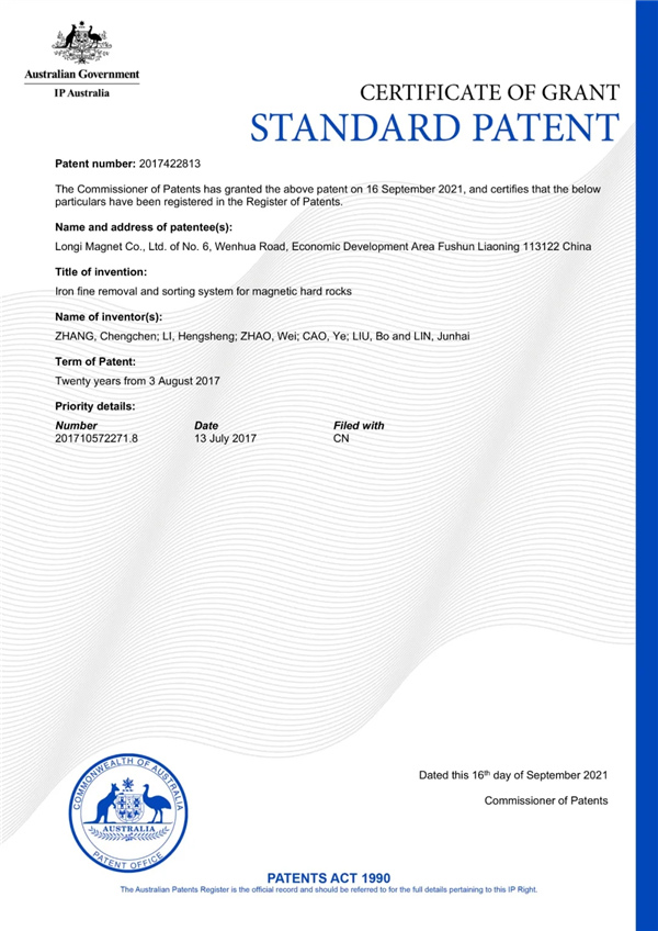 近日,隆基正式收到頑石除鐵系統澳大利亞專利證書,在頑石除鐵全球市場布局方面取得重要突破。 2021-11-22