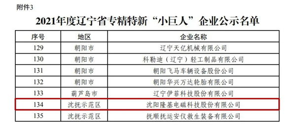 近日,隆基電磁成功入選2021年度遼寧省專精特新“小巨人”企業(yè)。