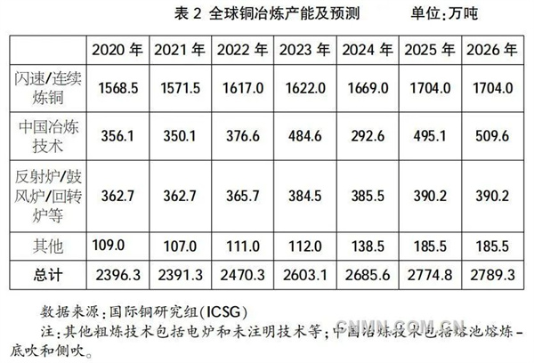 截至2022年底,全球銅冶煉產能2470.3萬噸。其中,使用閃速/連續煉銅技術的產能1617.0萬噸,占比為65.5%(見表2)。